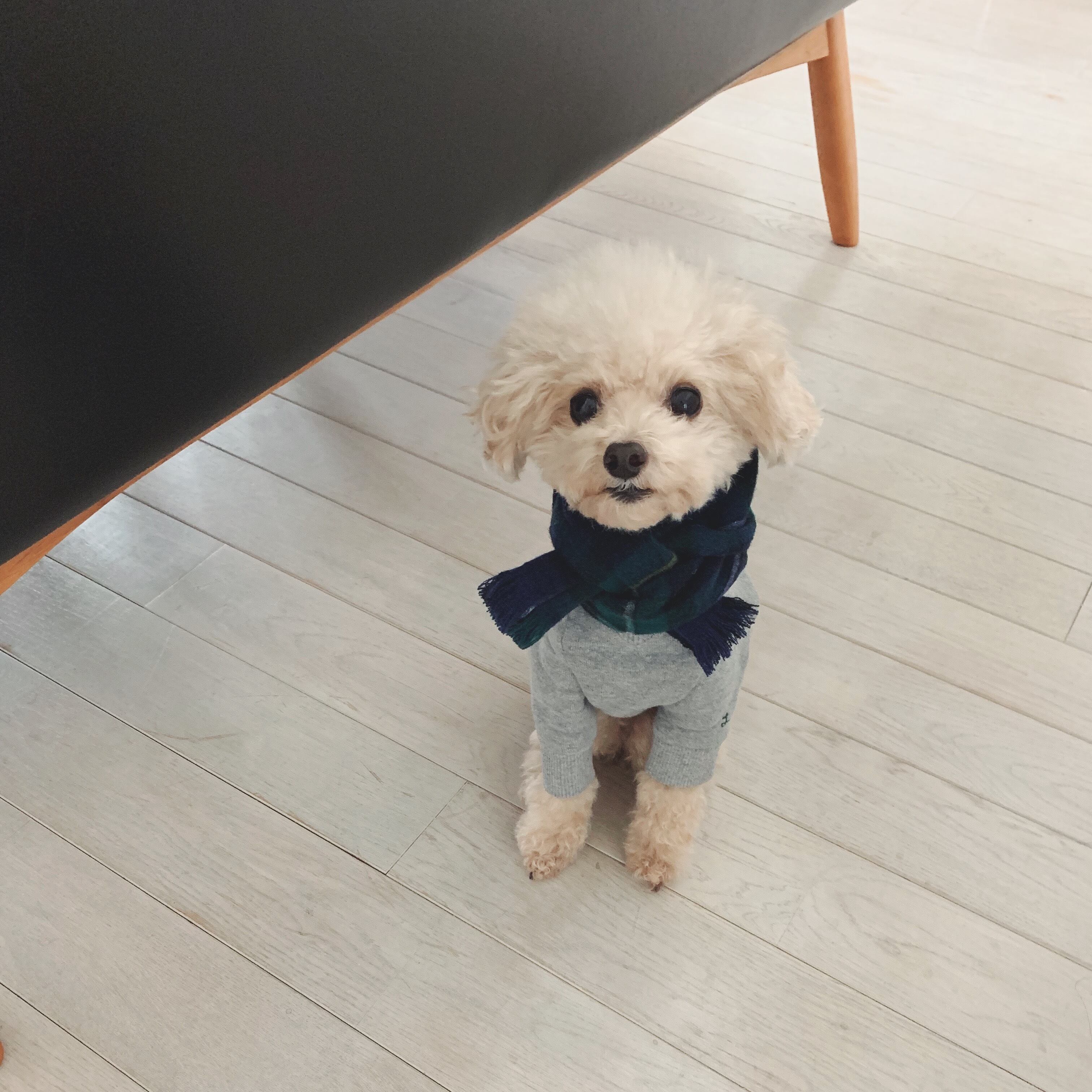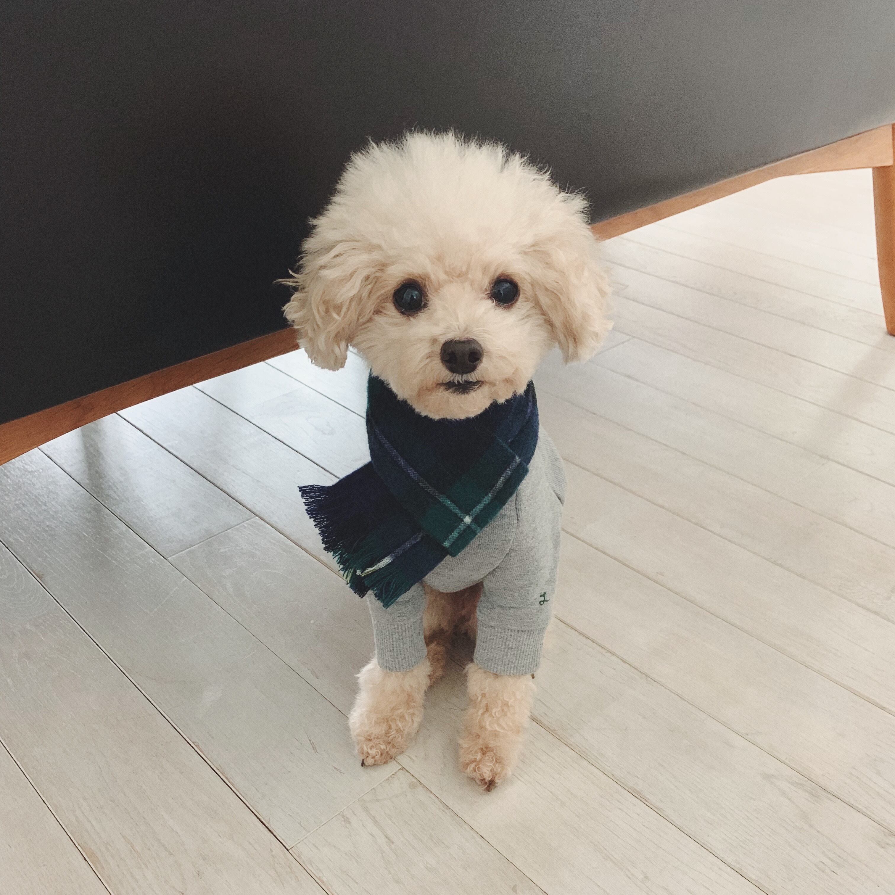 写真のわんこは首周り19㎝で、SSサイズのものを着用しています。