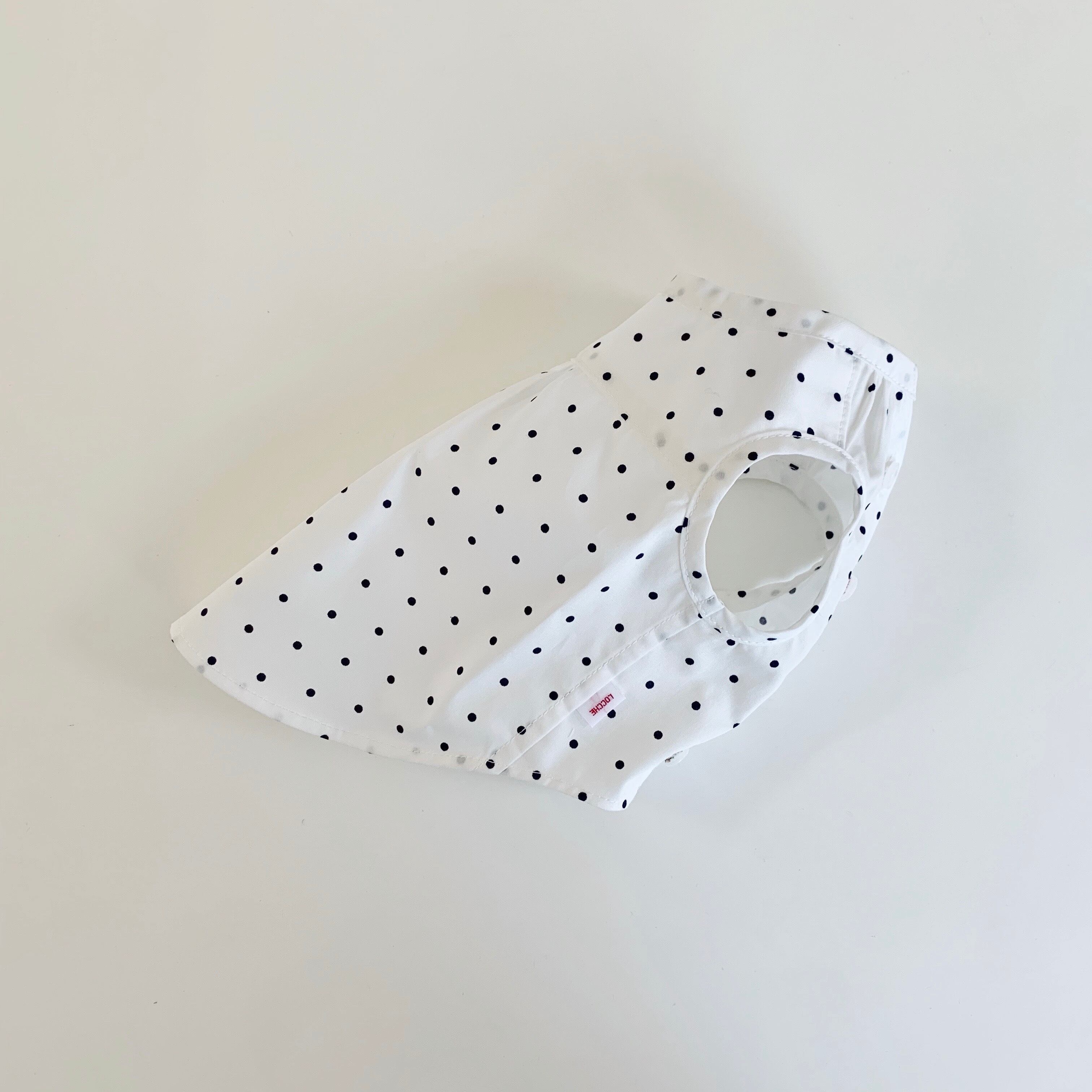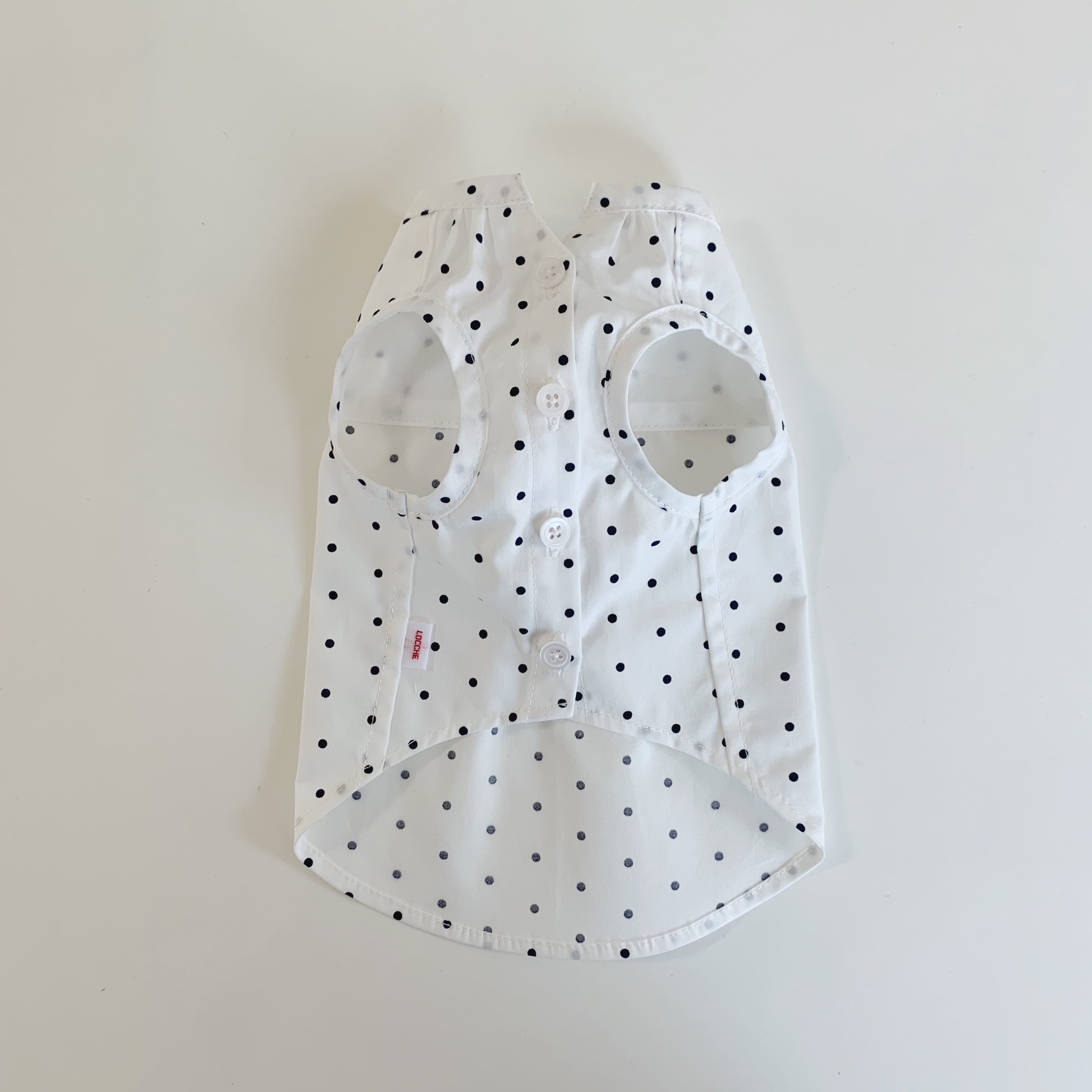 かわいらしいドット柄ですが、衿元はスキッパーのようなすっきりしたデザインで甘さを抑えています。