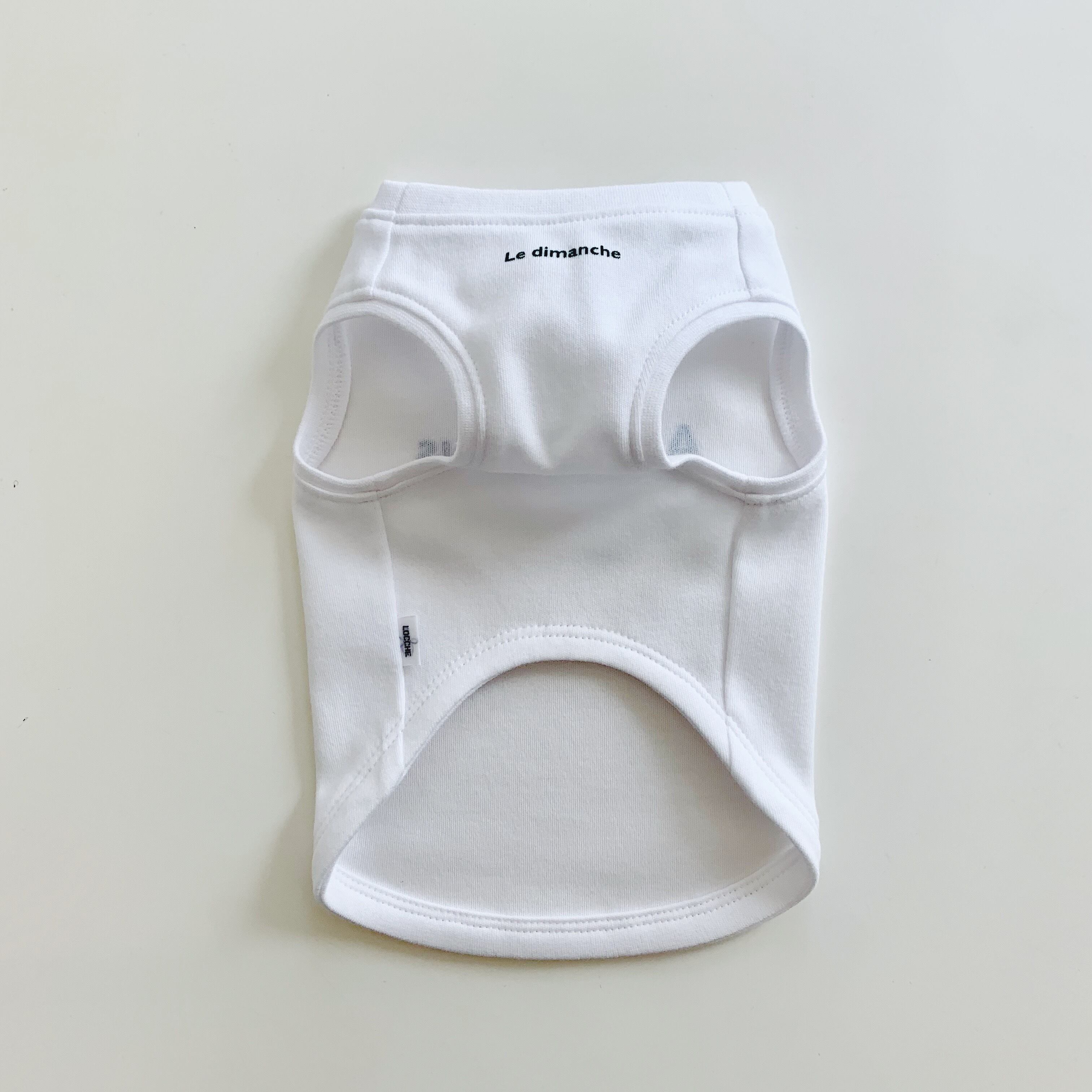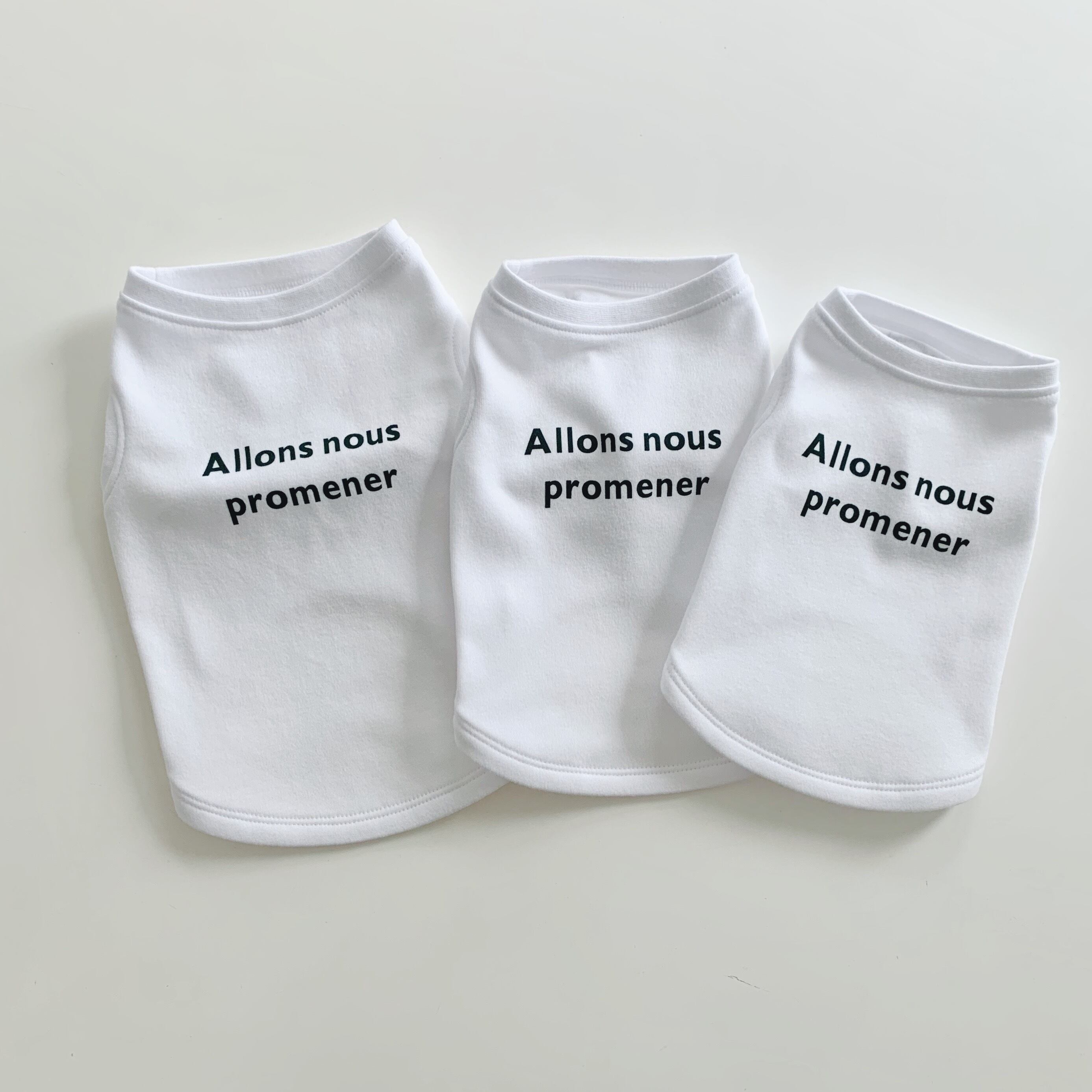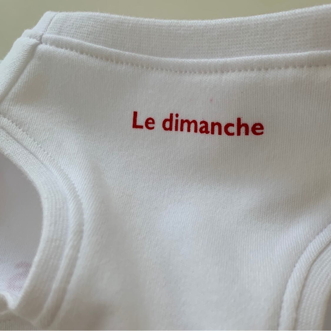 フランス語で、背中に“散歩に行こう”、胸元に“日曜日“ のロゴが入ったノースリーブTシャツ。