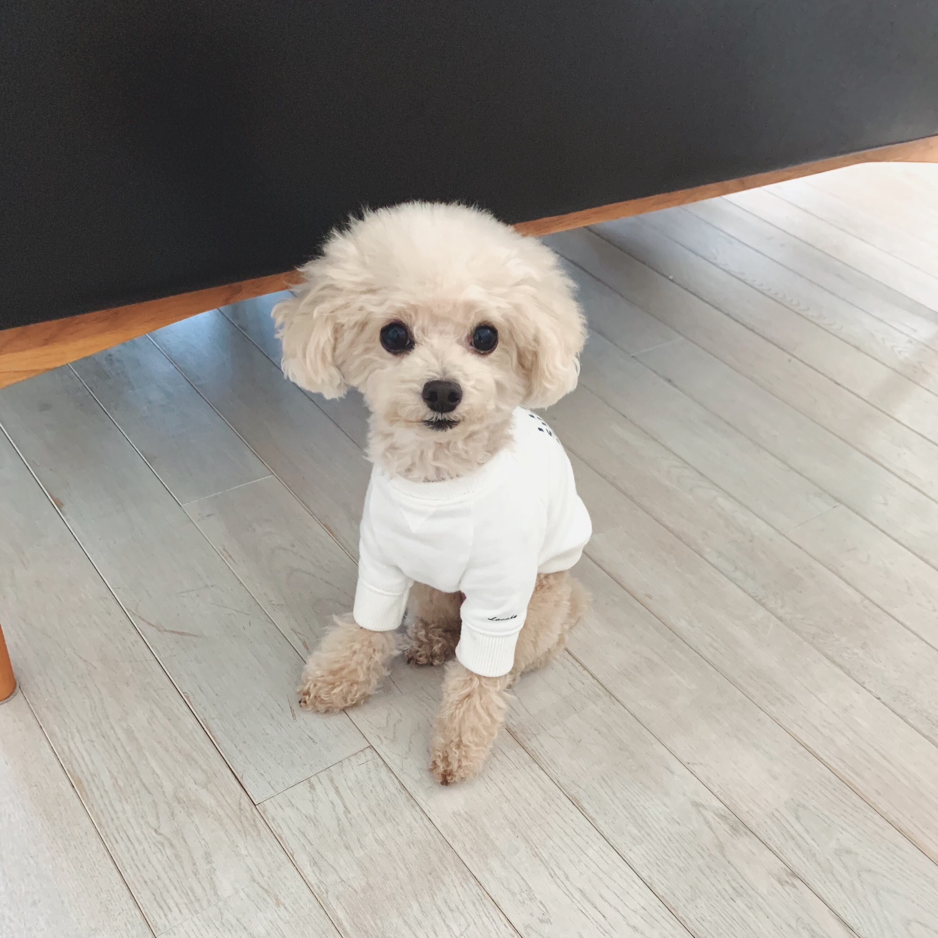 写真のわんこは、首周り19㎝、胴周り31㎝で、SS(−)のものを着用しています。
