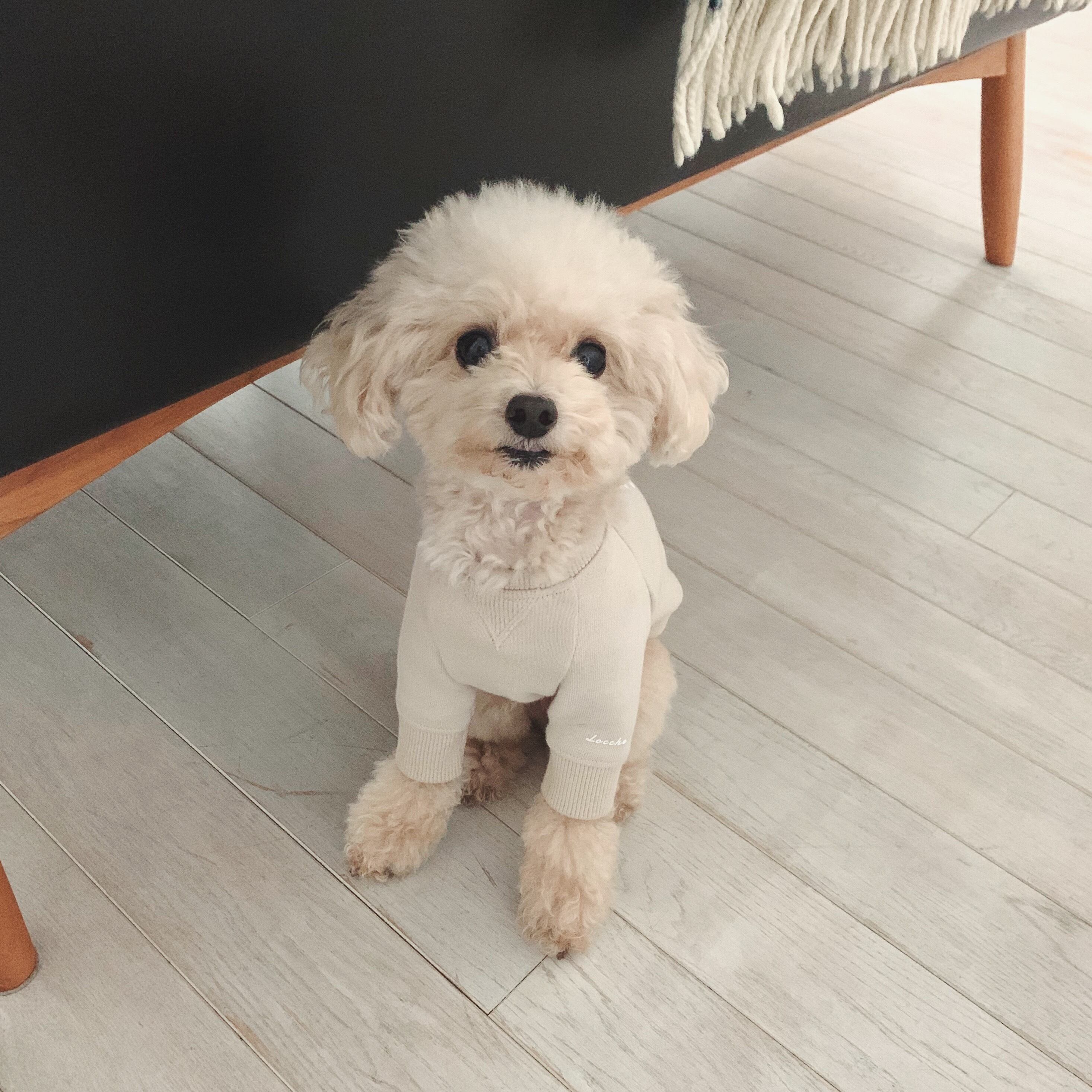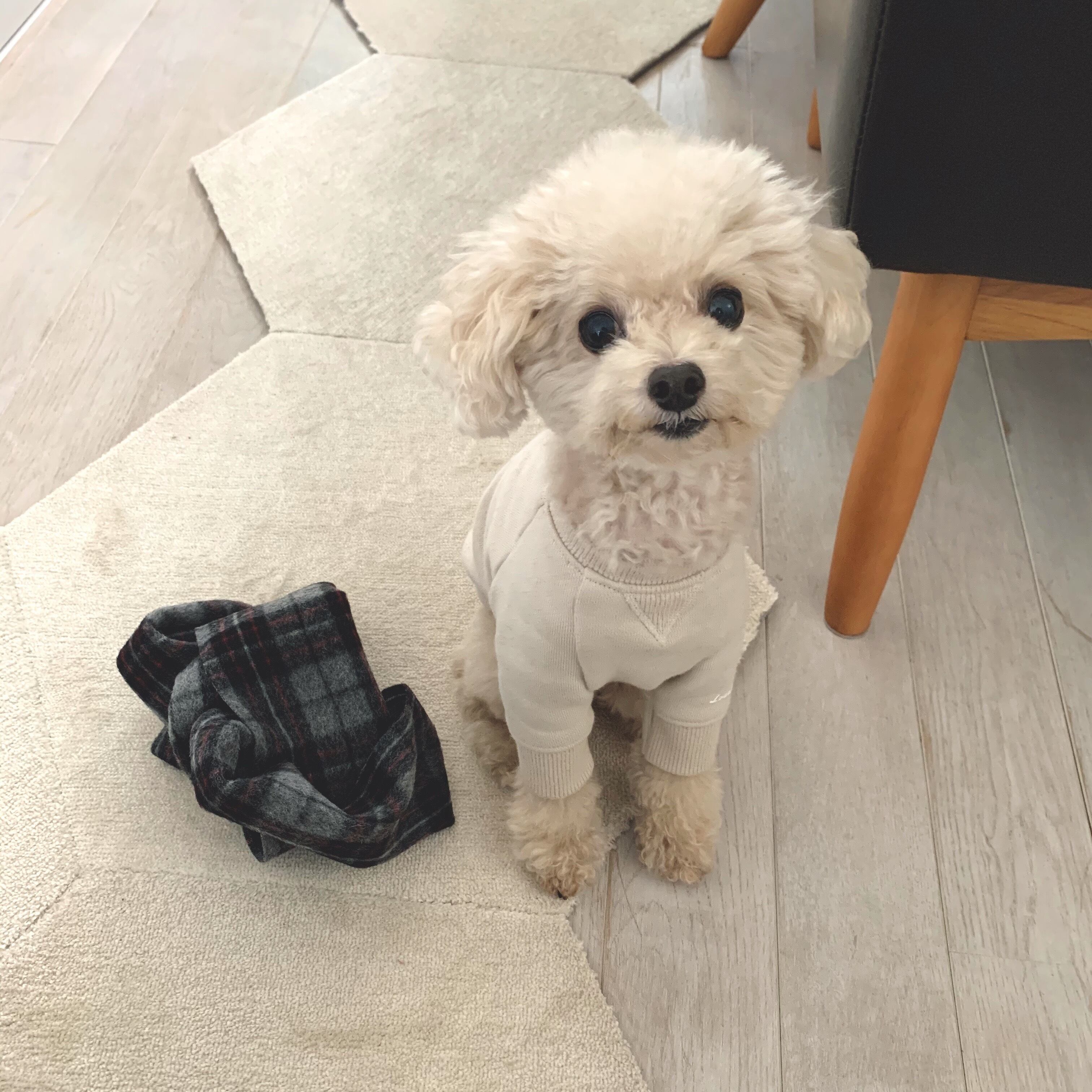 写真のわんこは、首周り19㎝、胴周り31㎝で、SS(−)のものを着用しています。