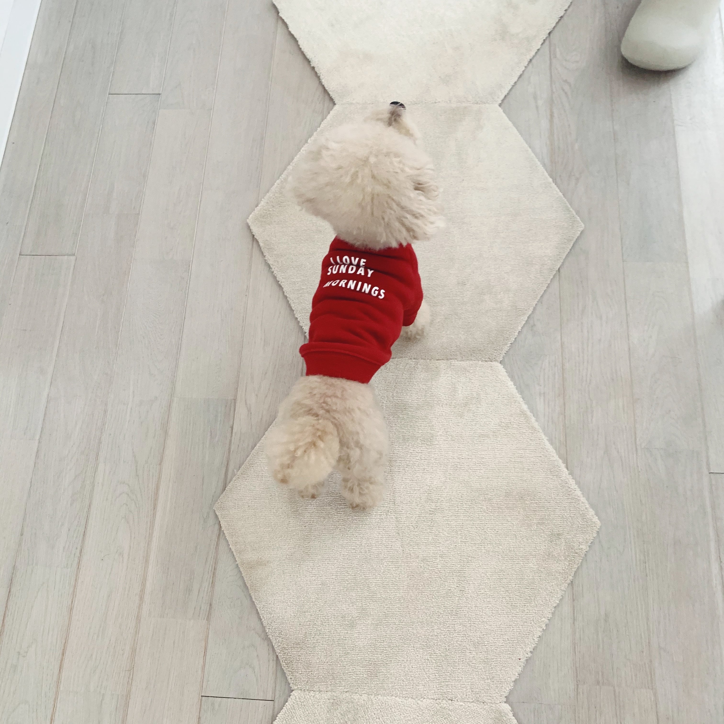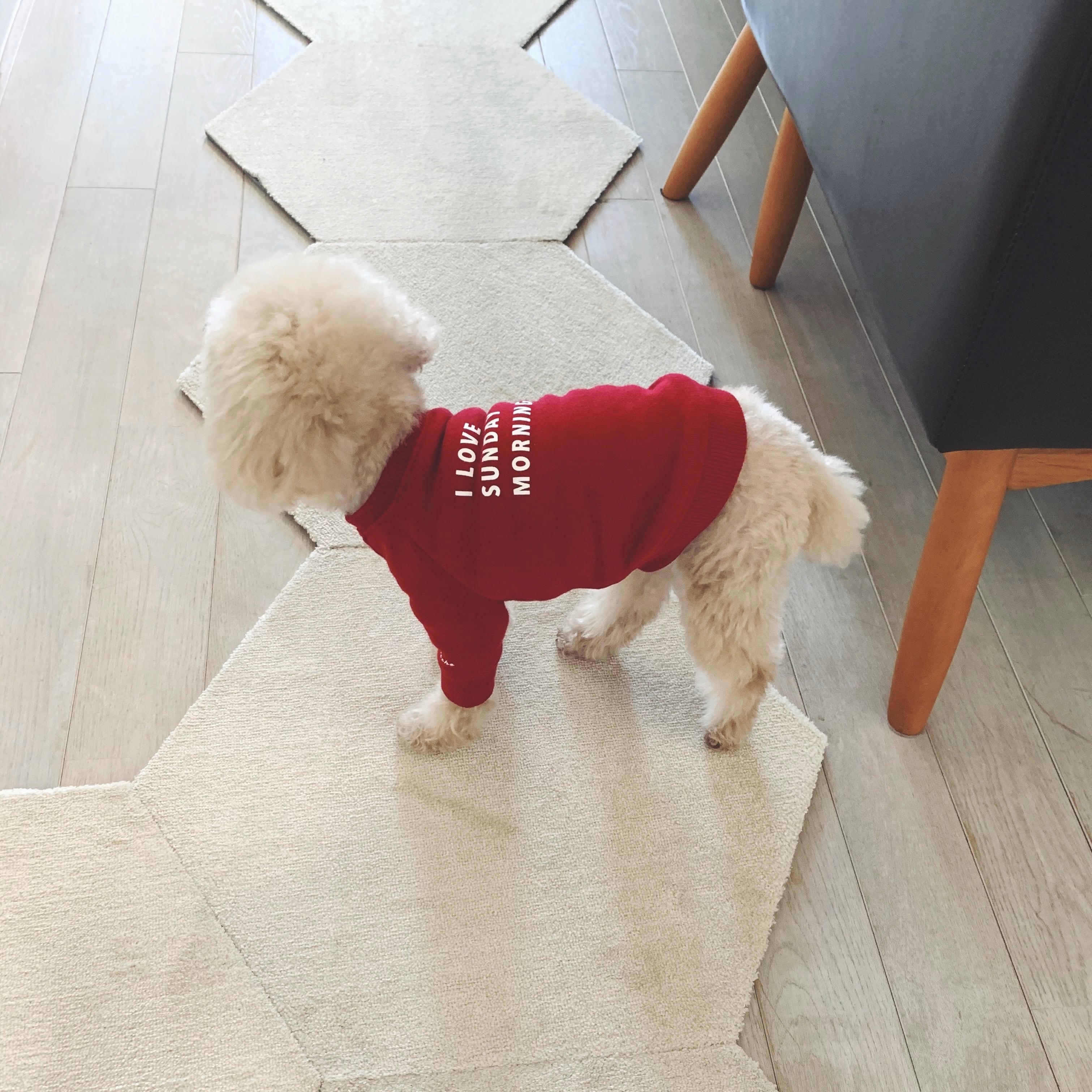 写真のわんこは、首周り19㎝、胴周り31㎝で、SS(−)のものを着用しています。
