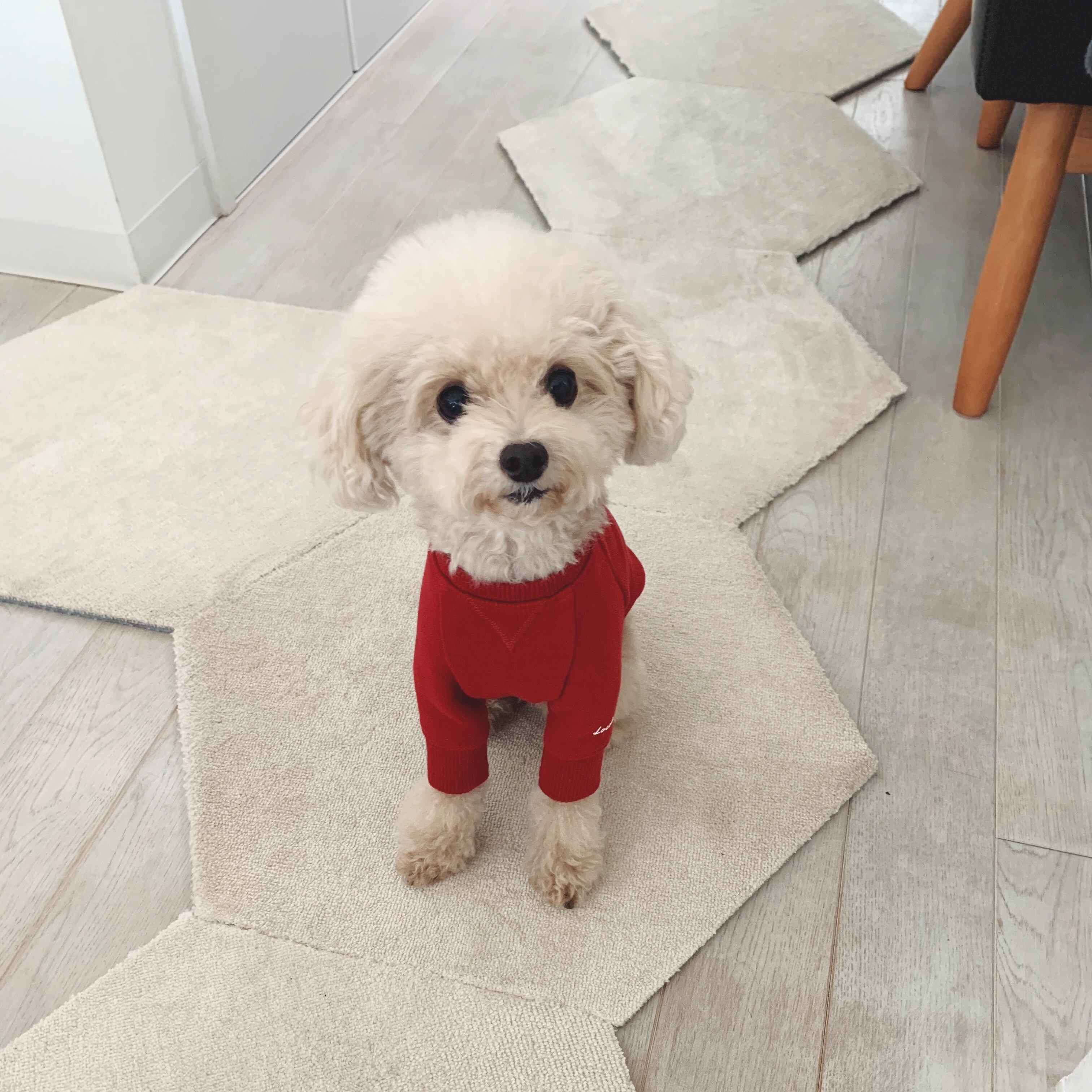 写真のわんこは、首周り19㎝、胴周り31㎝で、SS(−)のものを着用しています。