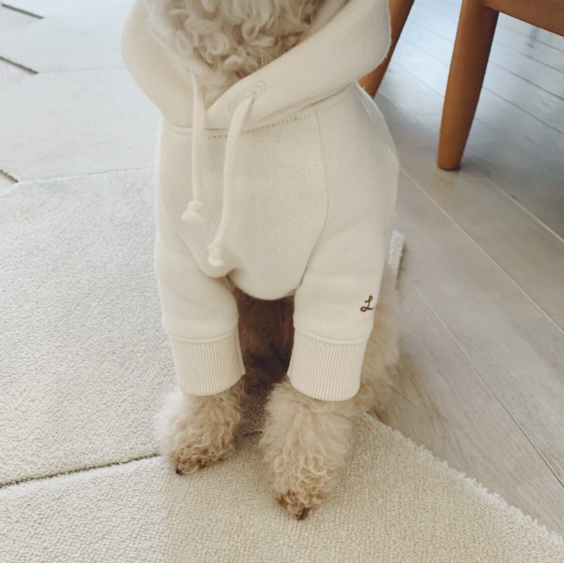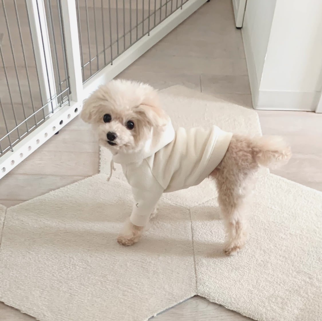 モデルのトイプードルは首周り19cm、胴まわり31cmで、SS(-)のものを着用しています。