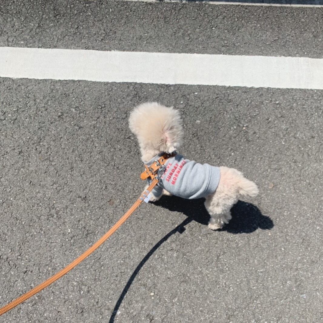 写真のトイプードルは、首周り19㎝、胴周り31㎝で、SS(−)のものを着用しています。