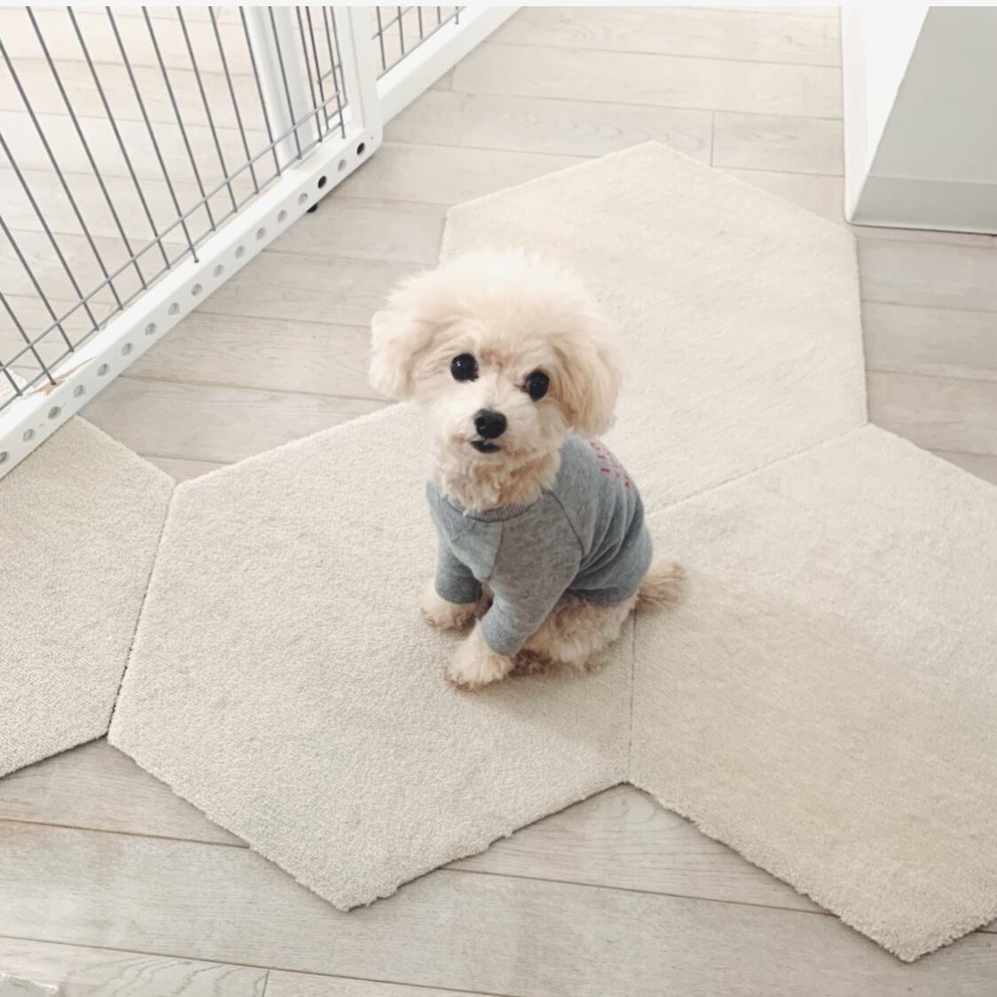 写真のトイプードルは、首周り19㎝、胴周り31㎝で、SS(−)のものを着用しています。