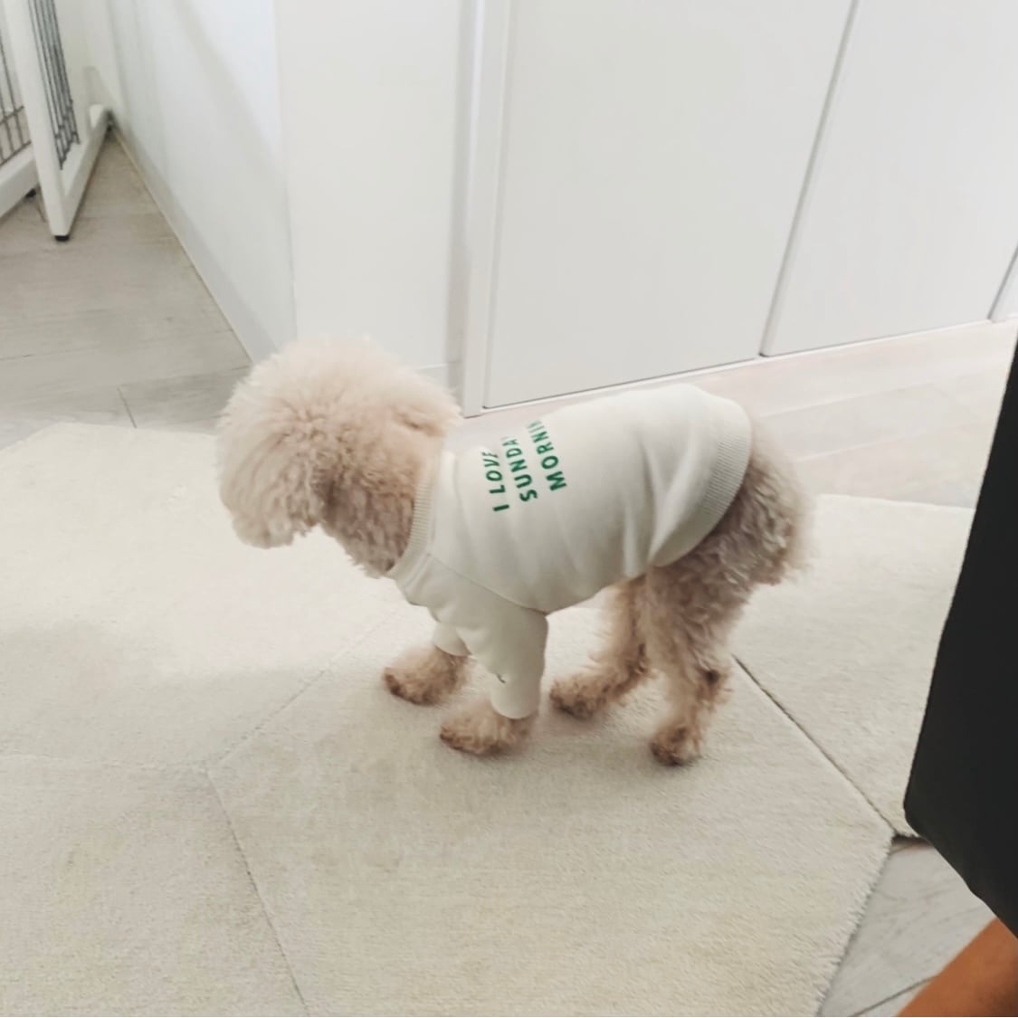 写真のわんこは、首周り19㎝、胴周り31㎝で、SS(−)のものを着用しています。