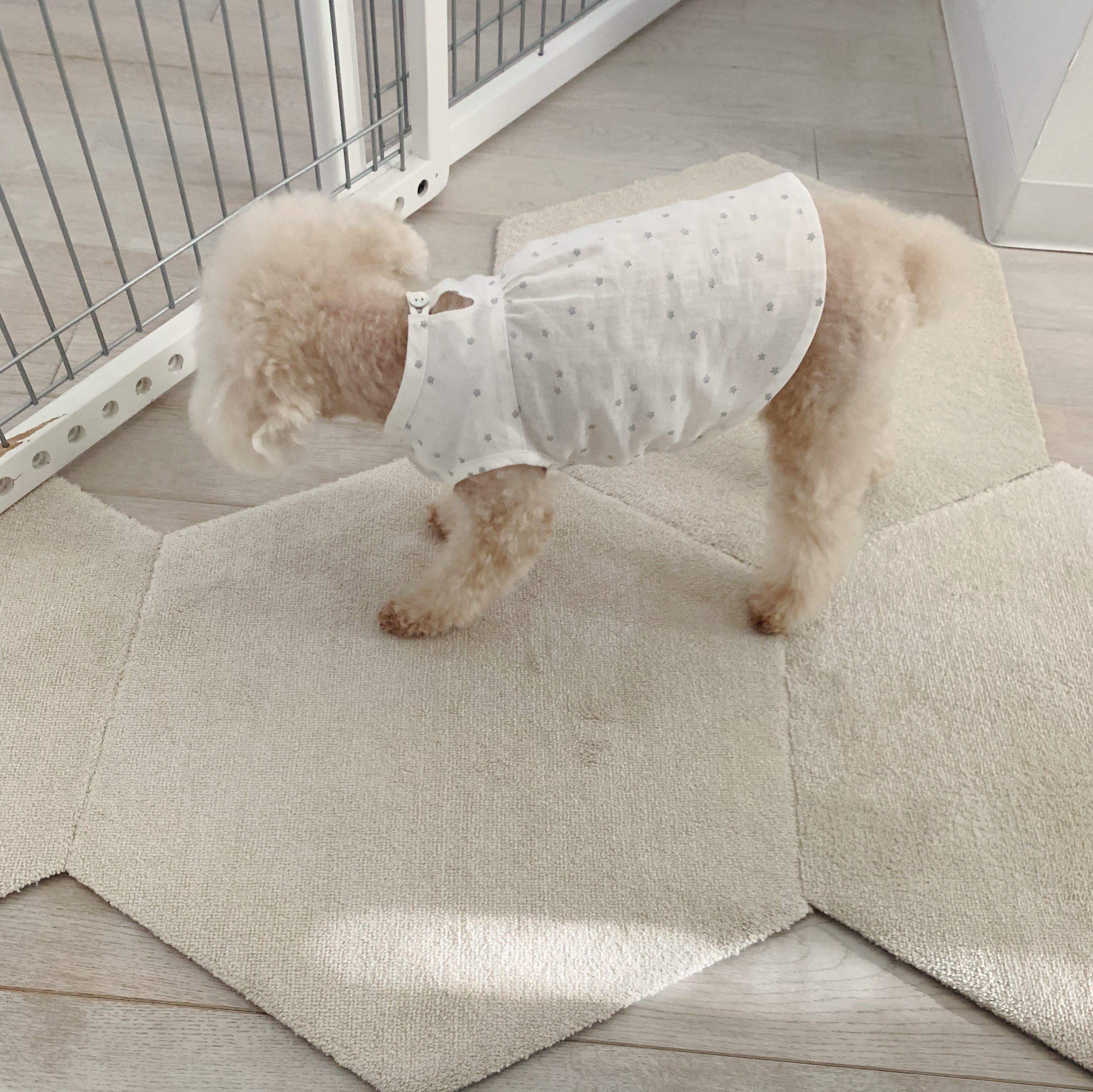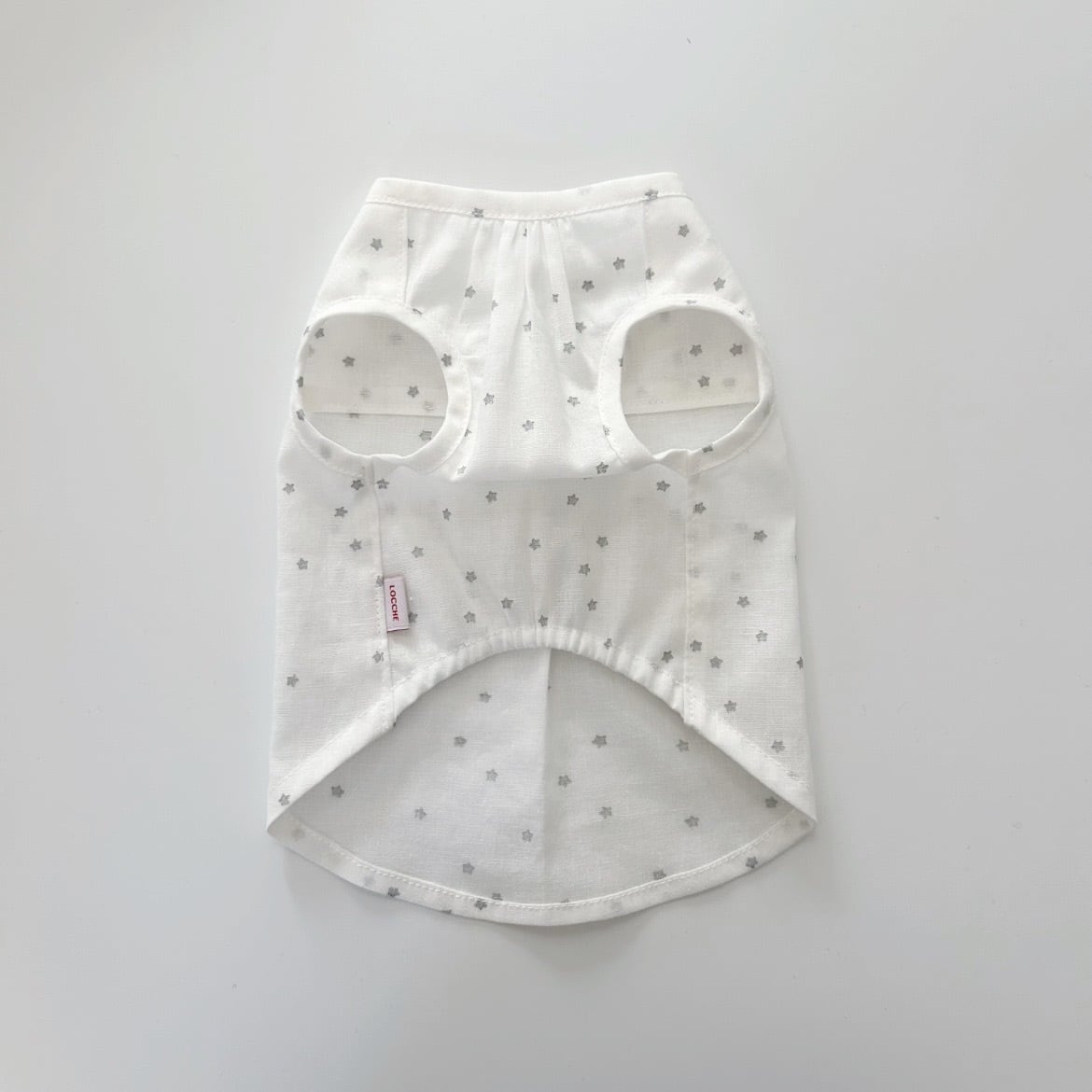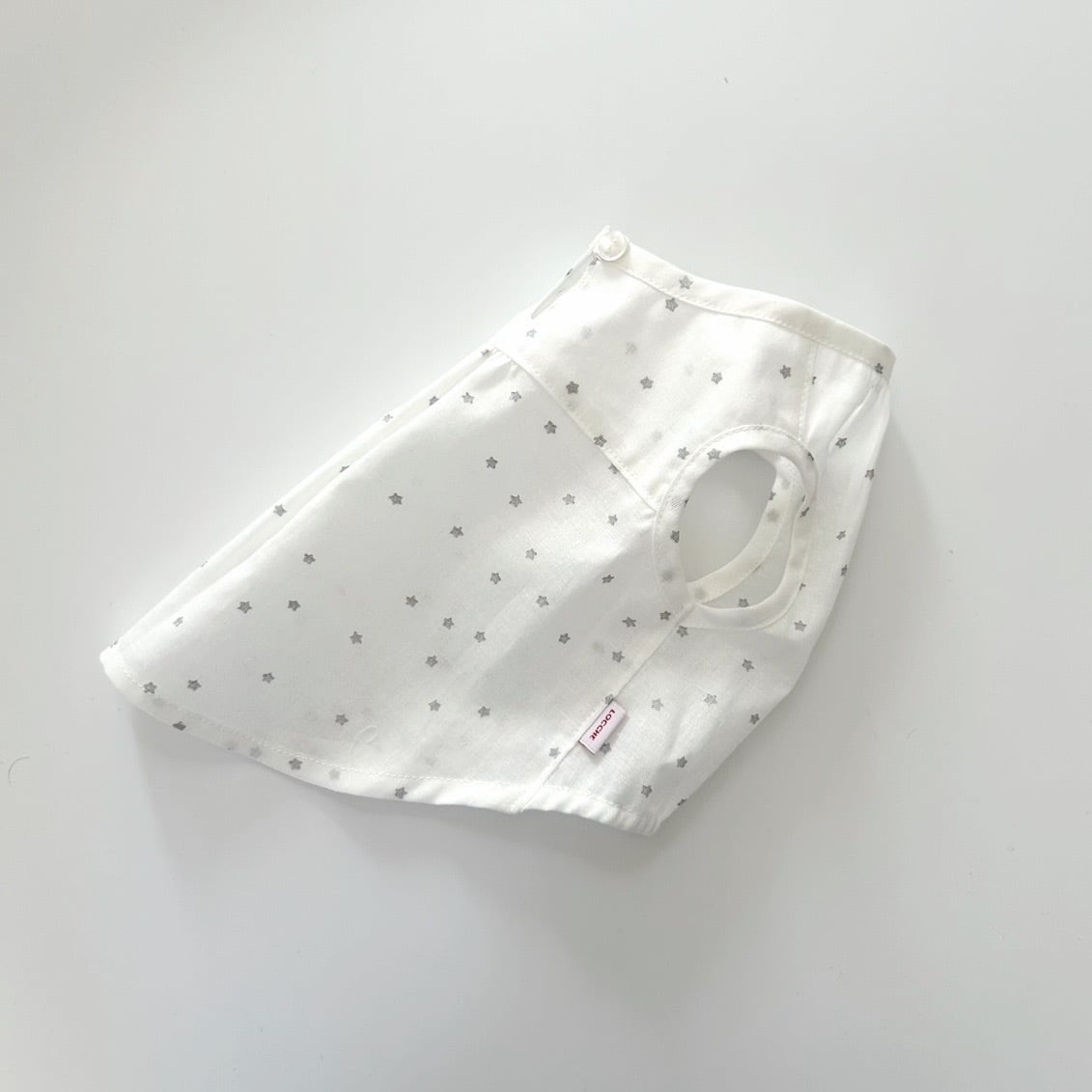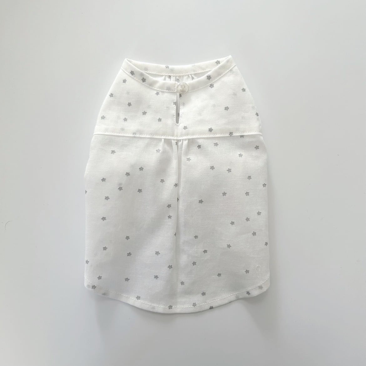 オフホワイトにシルバーの星、首元と背中のギャザーがふんわりと優しい雰囲気です。